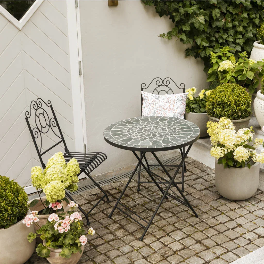 When it comes to garden furniture, there are many different shapes and materials to choose from. Everything from classic white-painted wooden furniture, decorative metal chairs, to French café tables. You can also opt for durable furniture made of synthetic rattan with decorative rugs and lounge sets in acacia wood. Or why not make your own furniture? It could be a seating area made of pallets with cushions and carpets, or self-cast concrete slabs on stands that can serve as tables and benches.