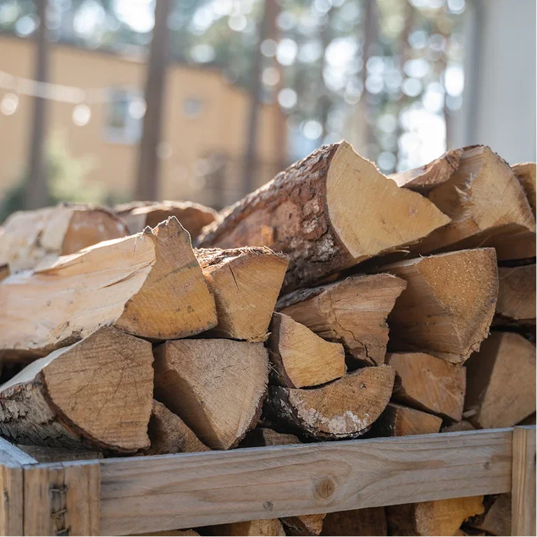 Färdig björkved på pall och i säck