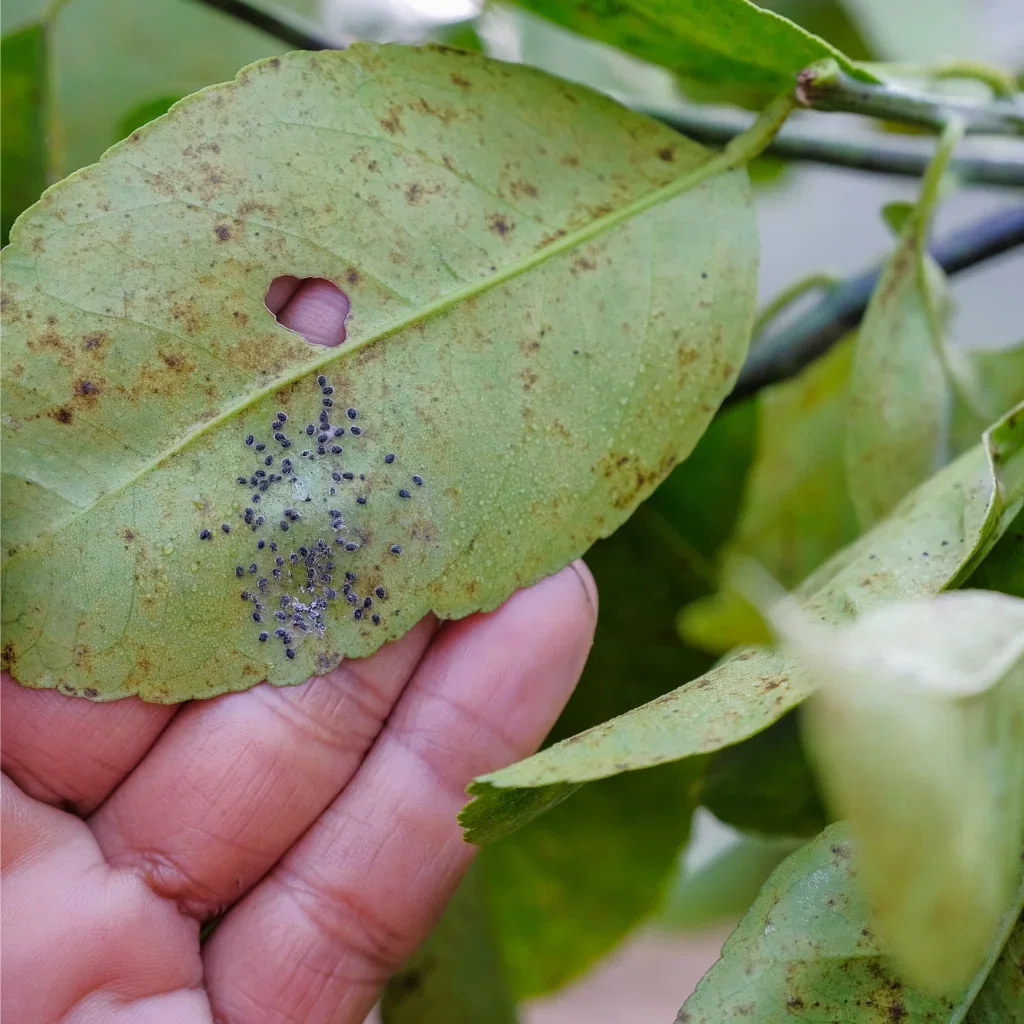 Tripsens exkrementer på undersidan av ett blad är ett tydligt tecken på att växten är angripen av den plågsamma gästen.