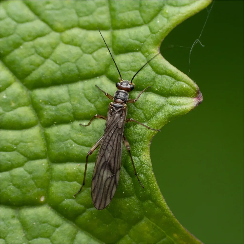 En vuxen trips, redo att lägga ägg. Vuxna individer är ofta mörkare och flyger när de störs, vilket bidrar till snabb spridning mellan växterna.
