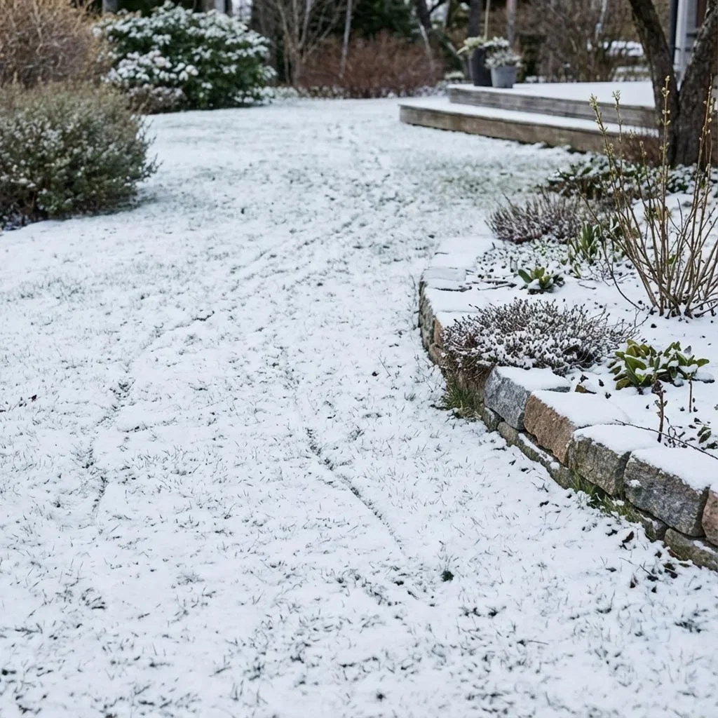 - Undvik att gå på gräsmattan när den är täckt av snö och is.