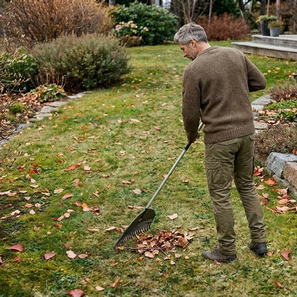 - Ta bort löv, kvistar och dött gräs med en lövräfsa.