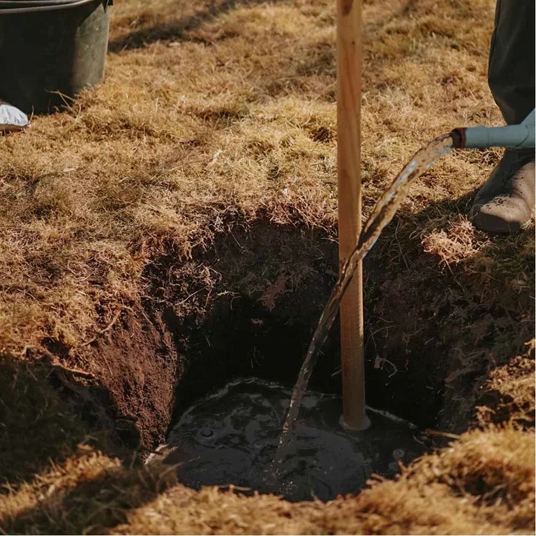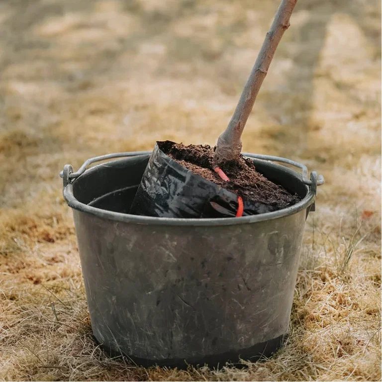 Ett annat knep är att jag innan planteringen fyller planteringsgropen med vatten som sedan får sjunka undan. På så vis mättas jorden runtomkring planteringsgropen också med vatten. Det här gör att planteringsgropen och jordklumpen kommer hålla sin fuktighet längre. Det här är extra bra om det är torrt i marken du ska plantera trädet i.