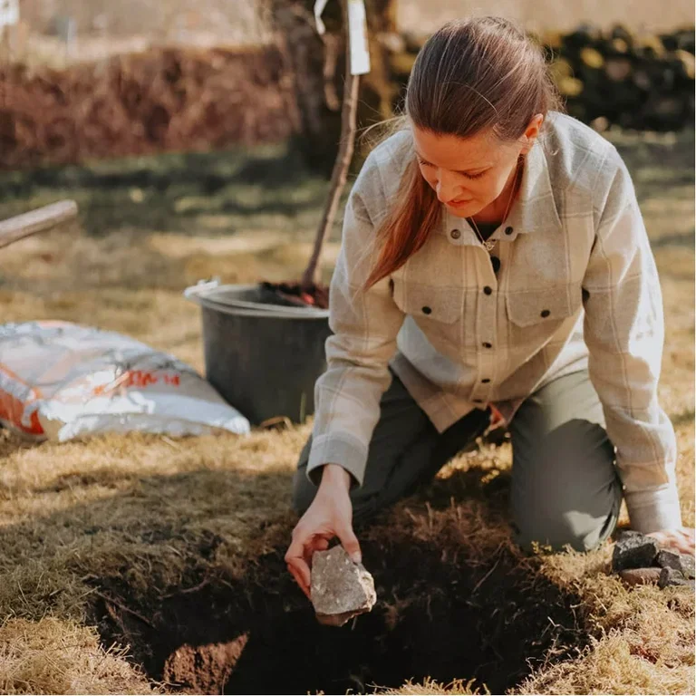 Nästa till tips är att lägga stenar i botten på gropen för att skapa en stabil botten så att rotklumpen inte sjunker när jorden sätter sig. När man fyller på med jord kryper den in mellan stenarna. Och stenarna skapar en hållbar struktur för rotklumpen att vila på. Annars ska jorden under rotklumpen vara ordentligt packad så att inte jorden kan sjunka så mycket.