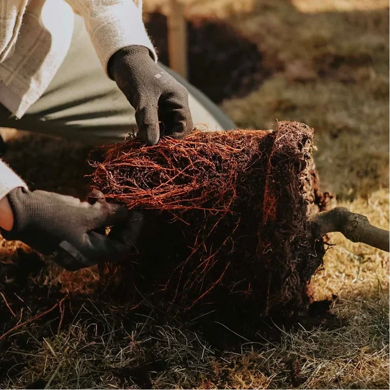 Lös upp rotklumpen på trädet lite försiktigt med händerna så att du frigör de yttersta ut rötterna. Det här hjälper rötterna att snabbare leta sig utåt och förankra trädet i marken.